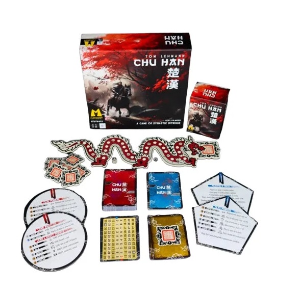 Le Chu Han est un jeu de ruse, d’escalade et d’élimination qui se compose de plusieurs mains. Les joueurs commencent chaque main avec un mélange de cartes Chu et Han, représentant les tensions au sein des clans, les prises d’otages et les changements d’allégeance. Des événements optionnels et deux campagnes historiques apportent une variété supplémentaire.