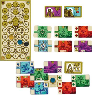 Contenu: 6 cartes de départ, 80 cartes, 15 cartes objectifs, 1 piste de score, 9 pions.