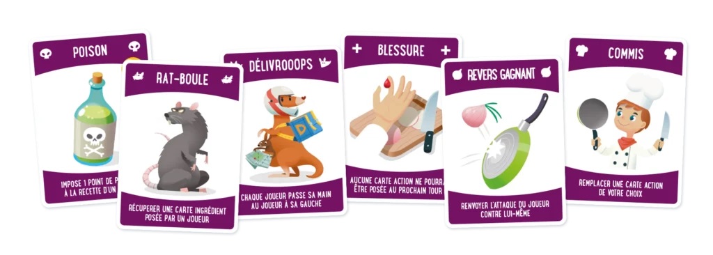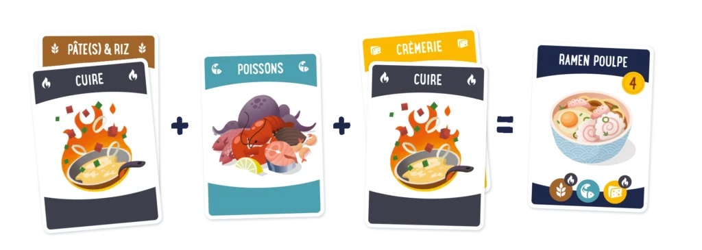 Pour se faire, vous allez devoir vous mettre aux fourneaux pour cuisinier de savoureux plats, le plus rapidement possible. Chaque recette réalisée vous rapporte un nombre de points. Le premier cuisinier qui a 12 points remportera la partie. Il vous faudra alors rassembler les bons ingrédients, en cuire certains, en couper d’autres en espérant qu’un de vos adversaires ne réalise pas la recette que vous visiez avant vous.