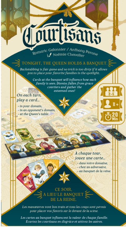 Les retournements de situations sont légions car certains Courtisans ont des rôles spécifiques. Des espions pourraient se glisser dans votre jeu et rendre l’issue incertaine. À moins que des assassins viennent vous retirer les cartes vous rapportant le plus. Pour obtenir le plus de points et l’emporter, vous devrez collectionner les bonnes familles tout en préservant leur valeur à la table de la reine.