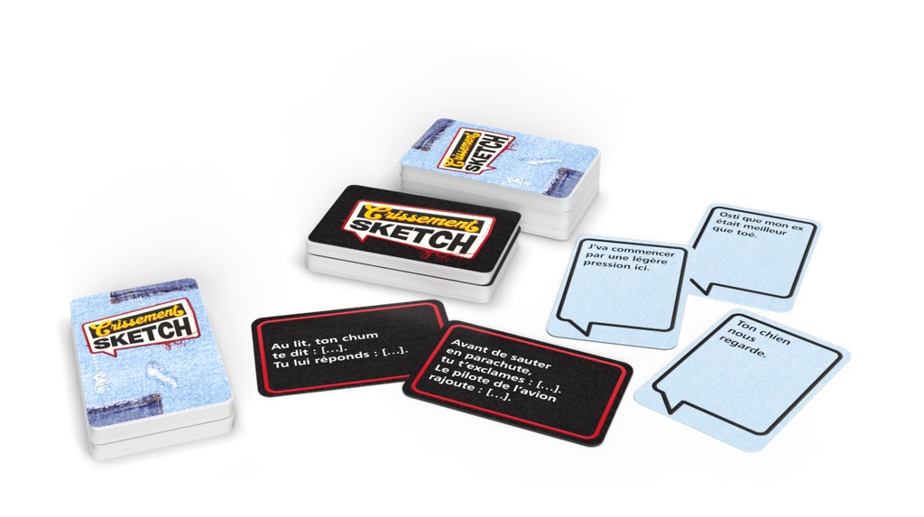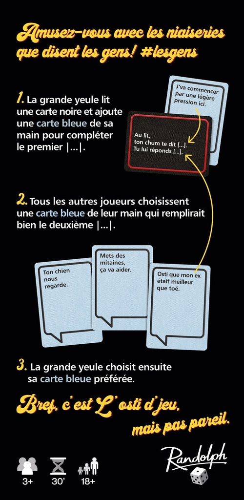 Dans ce jeu crissement sketch, les cartes bleues sont des choses que disent les gens. Les cartes noires, des situations de vie. Mélange les deux pis tu vas avoir des affaires comme :