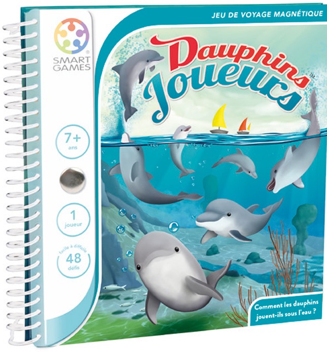 Les dauphins aiment sauter hors de l’eau et effectuer des figures… Nous ne les voyons qu’à ces rares moments. Trouves les positions qu’ils occupent sous l’eau avec ce jeu de déduction mettant en jeu sept tuiles magnétiques toute une famille de dauphins. Dauphins Joueurs est un jeu de réflexion pour toute la famille proposant 48 défis de plus simple au plus compliqué. Ce jeu est idéal lors des voyages.