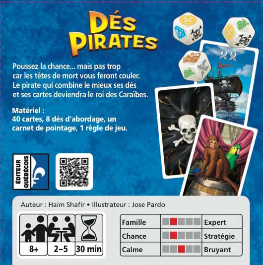À l’aide de 8 dés et d’une carte Pirate on part à l’aventure à la recherche de trésors. Mais les pirates ont peu d’amis; jusqu’où peut-on pousser sa chance avant que de se faire rattraper par les autres corsaires ?