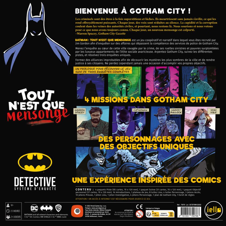 BATMAN™: TOUT N’EST QUE MENSONGE est un jeu coopératif et narratif dans lequel vous êtes recruté par Jim Gordon™ afin d’enquêter sur des affaires que le Gotham City™ Police Department (GCPD) ne peut résoudre seul.