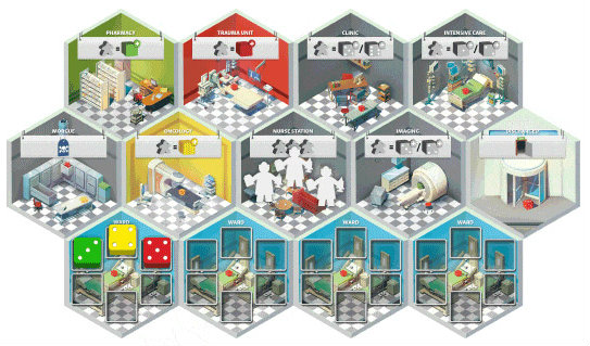 Le jeu utilise des mécanismes de placement d’ouvrier pour le personnel, des dés pour représenter les patients, un score de dé faible représente un patient en mauvaise santé.