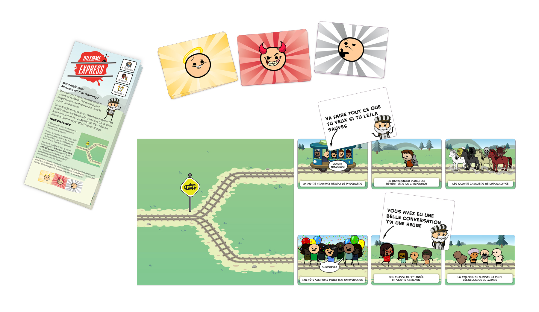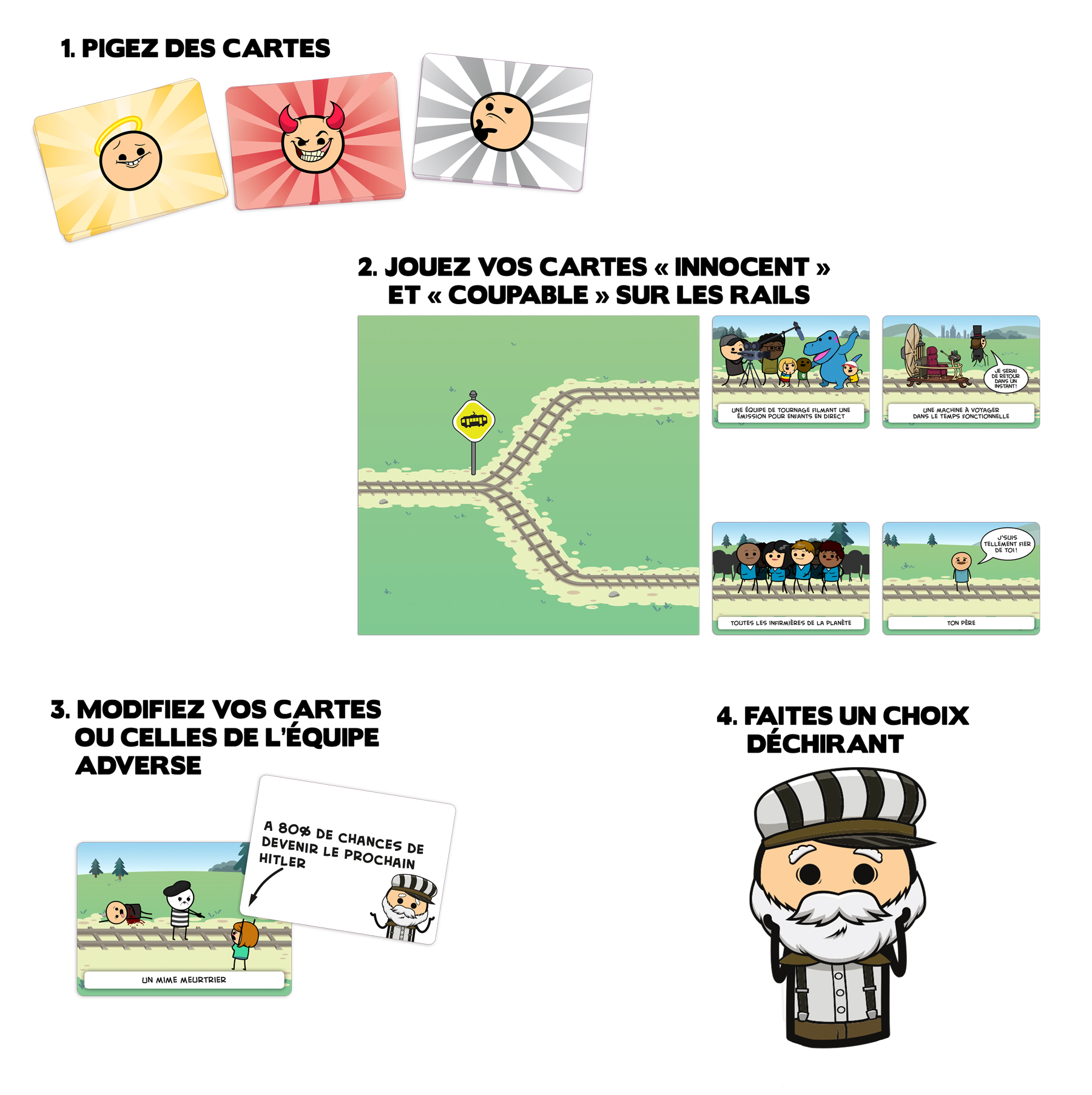 À chaque ronde, deux équipes s’affrontent en ajoutant différents personnages sur les rails du tramway : des personnages «Innocents», des «Coupables» ainsi que des «Modificateurs» qui viendront possiblement influencer le choix du conducteur du tramway. Le but de votre équipe est que le conducteur du tramway choisisse le rail de l’autre équipe !