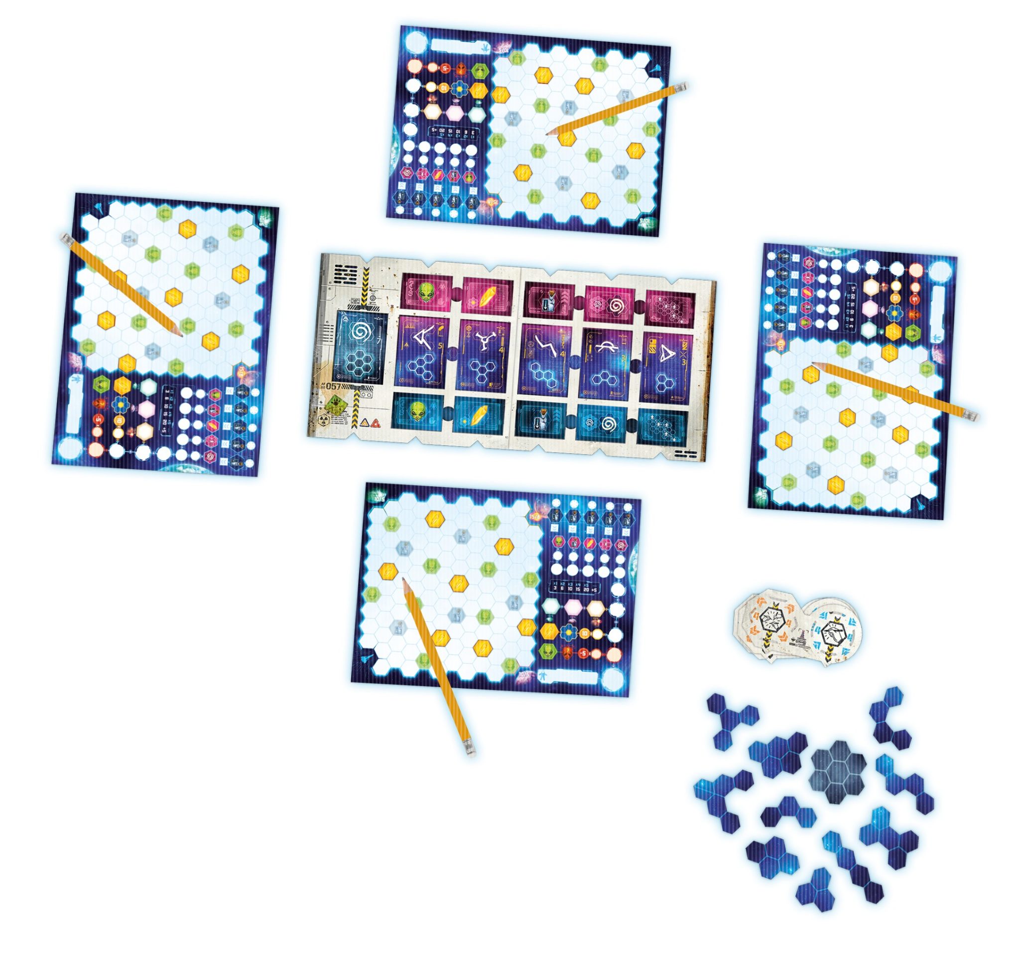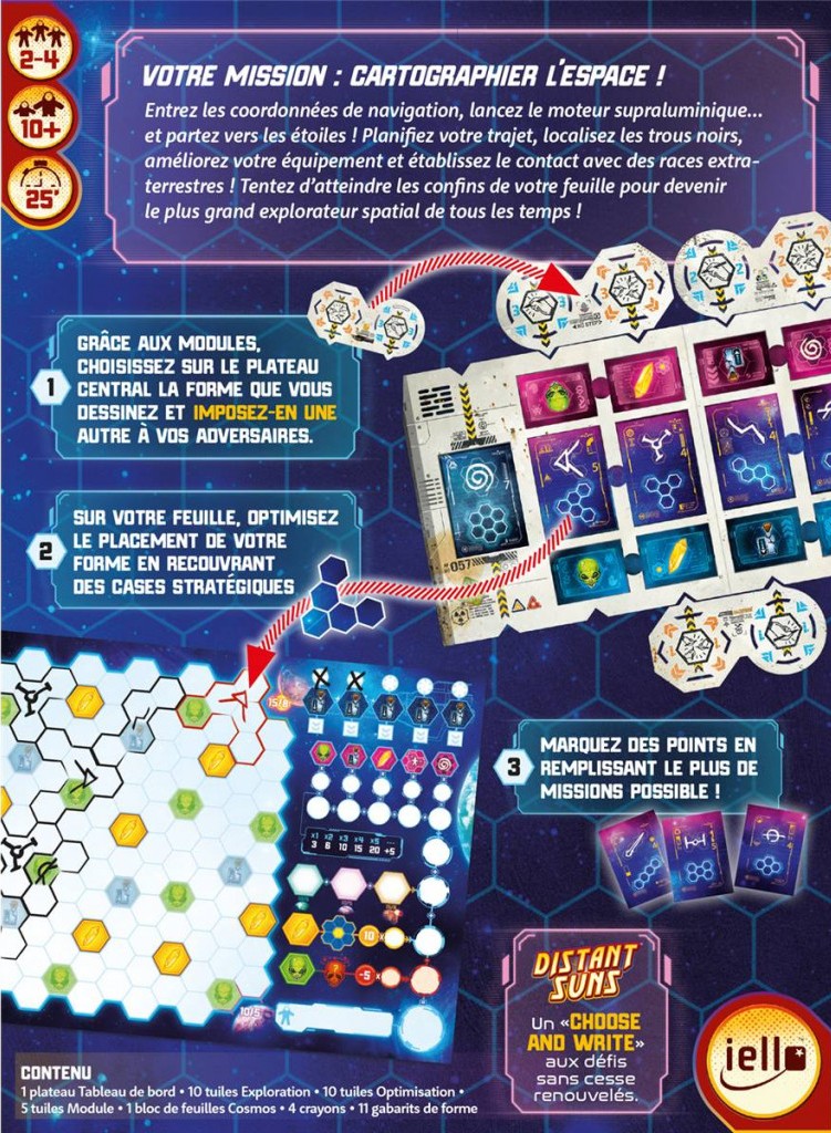 Distant Suns est un Choose & Write aussi astucieux que malin, particulièrement innovant dans sa mécanique. Les joueurs doivent dessiner des zones d’exploration, représentées par des formes hexagonales. Mais attention : en plus de choisir librement la forme de sa zone d’exploration, le joueur dont c’est le tour choisit aussi la forme que vont dessiner ses adversaires. Tous les joueurs doivent optimiser les emplacements des formes dessinées afin d’obtenir des bonus utiles en cours de jeu… et des points de fin de partie.
