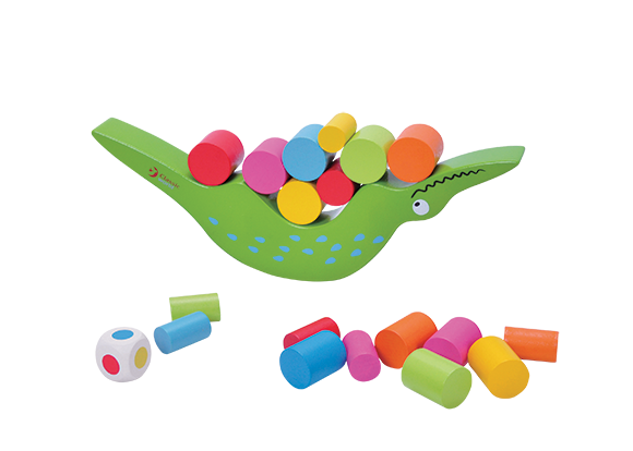 Placez les pièces de couleurs en bois une à une sur le ventre du crocodile tout en le gardant bien balancé.