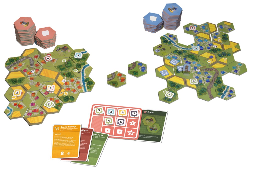 Dans Dorfromantik – Le Duel, deux personnes ou deux équipes s’affrontent pour créer le plus beau paysage: posez vous tuiles hexagonales pour parvenir à satisfaire les besoins des villageois·es et remporter plus de points que votre adversaire.