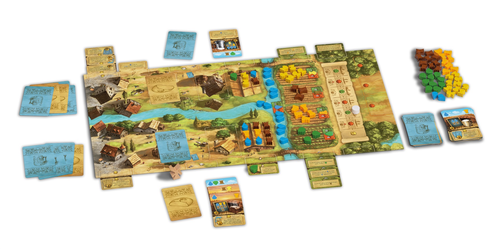 Contenu : 1 Plateau, 60 cartes, 84 jetons ressources en bois, 1 jeton Moulin à vent en bois, 1 jeton Année en bois, la règle du jeu.