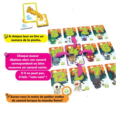 Vous pouvez soit canarder votre canard en le déplaçant sur la grille, soit couvrir vos cartes canard avec d’autres canards. Vous avez 3 tours pour obtenir le score le plus bas et être la mare la plus propre. Vos canards vont adorer !