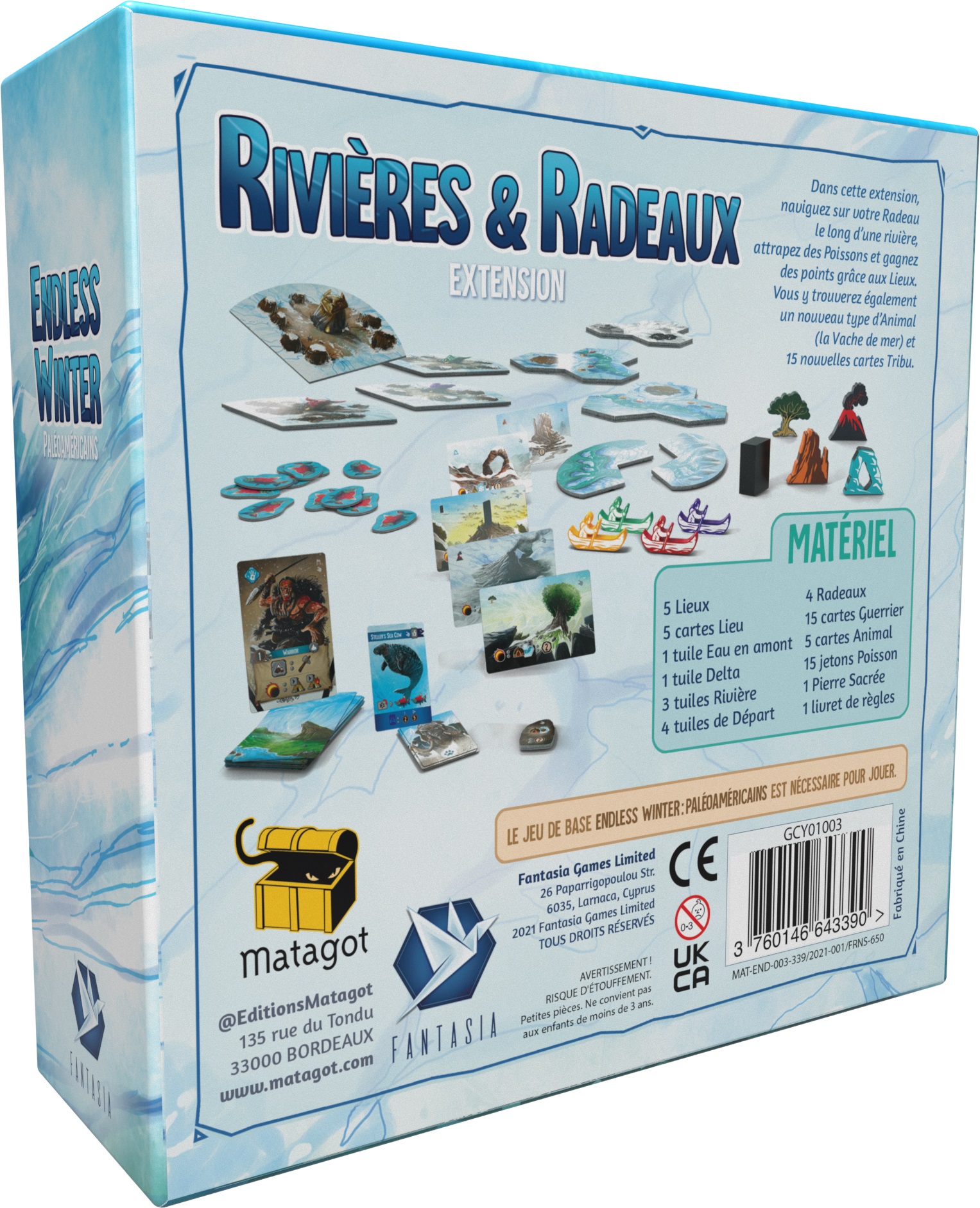 Contenu: 3x tuiles de terrain de rivière à 3 hexagones, 2x tuiles de début/fin de rivière, 4x tuiles de lieu de départ, 4x radeaux en bois, 5 pièces emblématiques, 5x cartes de point de repère, 15x cartes tribu (guerrier), 5x cartes d’animaux (vache de mer), 1x pierre sacrée, 1x livret de règles.
