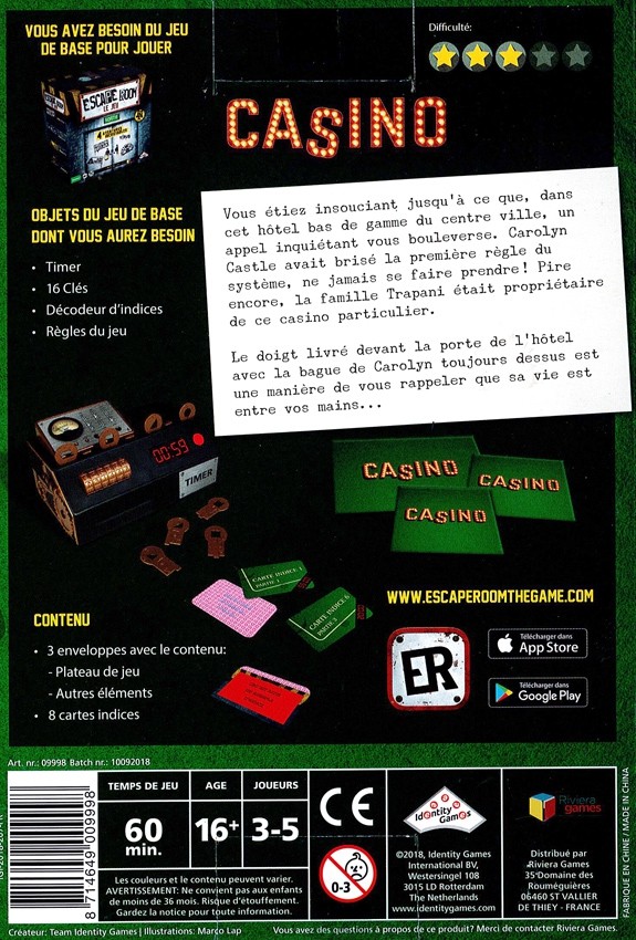 *Casino est une extension du jeu Escape Room – Le Jeu, il vous faudra le jeu de base pour y jouer car Décodeur d’indices, le Chrono et les clefs sont essentiel à l’expérience.