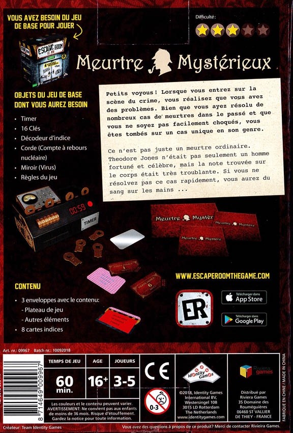*Meurtre Mystérieux est une extension du jeu Escape Room – Le Jeu, il vous faudra le jeu de base pour y jouer car Décodeur d’indices, le Chrono et les clefs sont essentiel à l’expérience.