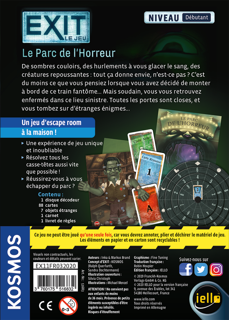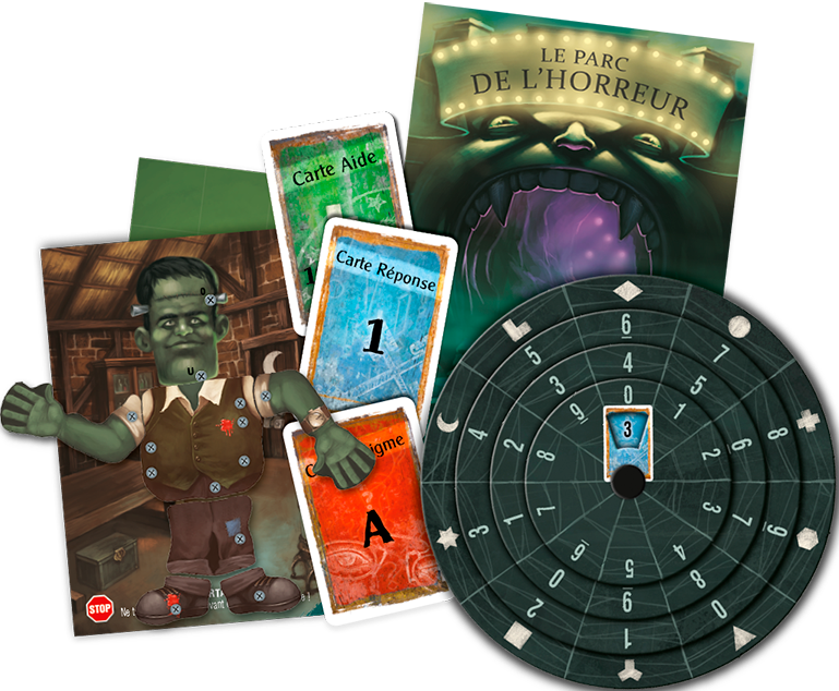 EXIT: Le Parc de l’Horreur est un jeu qui reprend les sensations des « escape games ». Muni d’indices, de matériel et d’un décodeur, vous aurez pour mission de sortir du jeu le plus rapidement possible.