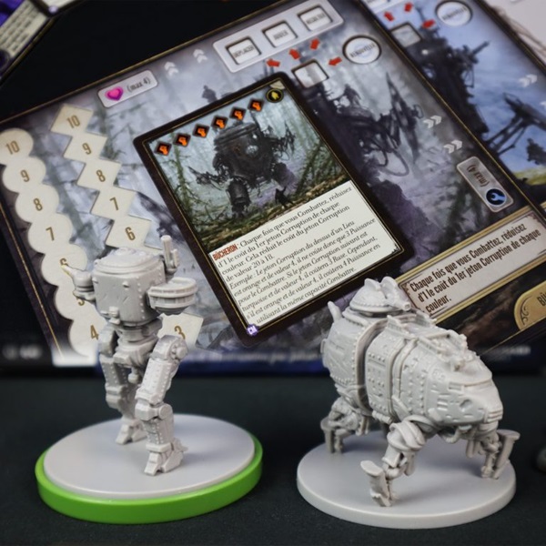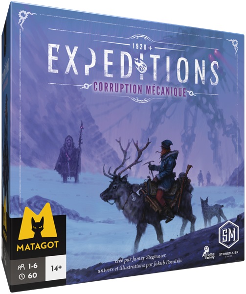 L’extension Corruption Mécanique d’Expéditions ajoute des éléments de risque et de danger sous la forme de bonus secrets sur les jetons de carte et d’un mécha corrompu qui erre sur le territoire.
