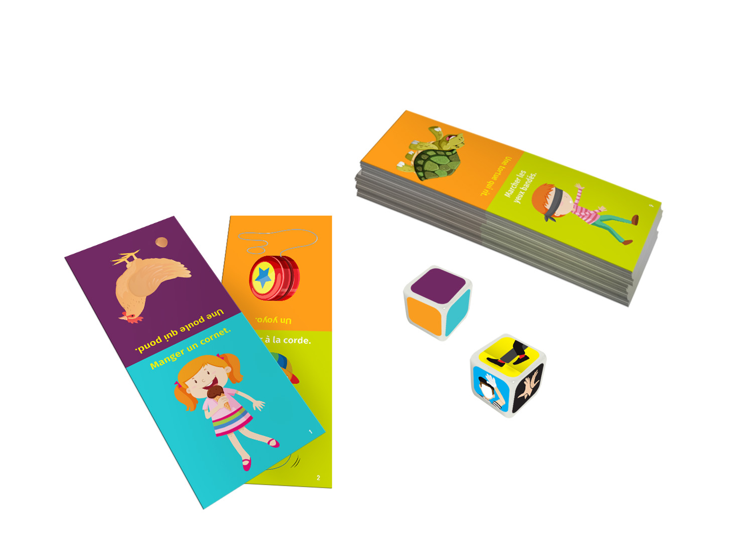 Pour encore plus de rires, ajoutez le dé de contraintes et mimez sur une jambe, les pieds croisés, un bras en l’air ou encore mimez en sautillant. Le joueur qui devine le plus grand nombre d’images gagne la partie.