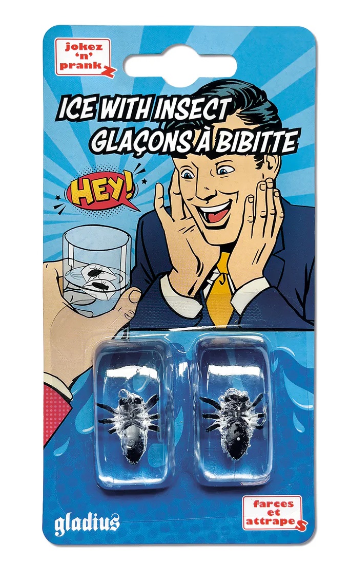 Faux cube de glace avec un insecte à l’intérieur. Il suffit de mettre les glaçons dans un verre d’eau et de l’offrir à tes amis ou de tes proches pour leur faire des blagues! Pour une surprise garanti et du rire!