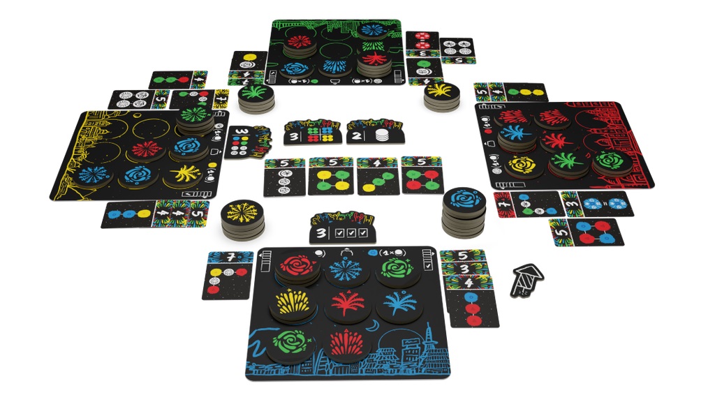 Contenu: 4 Plateaux joueur double-face (avec leur propre couleur et Feu d’artifice), 64 Tuiles Feu d’artifice, 32 Cartes Objectif, 4 Cartes Objectif de départ, 4 Tuiles Faveur du public double-face, 1 Jeton premier joueur, 1 Règle.