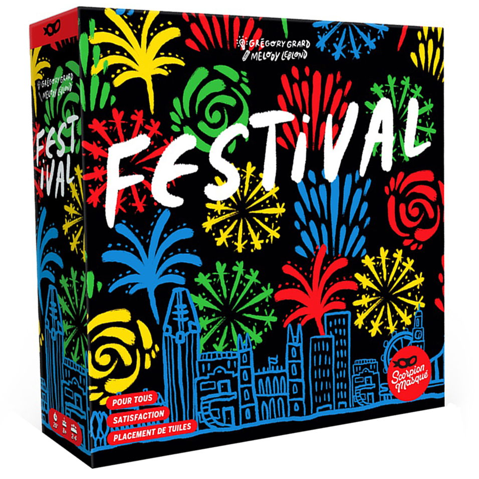 Festival est un jeu de placement et d’empilement de tuiles. À votre tour, vous avez le choix entre placer une tuile feu d’artifice ou choisir une carte objectif à compléter.