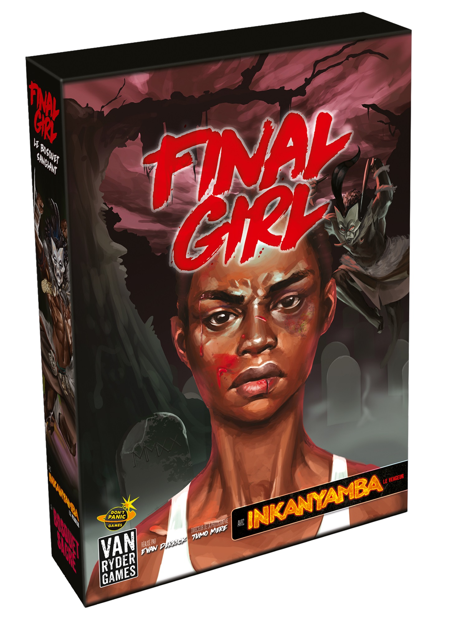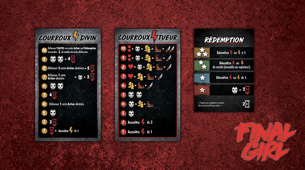 Contenu: 1 plateau Tueur détachable, 1 plateau Lieu détachable, 2 cartes Survivante, 24 cartes Terreur, 3 cartes Pouvoir Occulte, 1 carte Pouvoir Occulte légendaire, 2 cartes Action, 3 cartes Finale, 17 cartes Objet, 10 cartes Événement, 5 cartes Disposition, 5 jetons, 2 Livrets de règles, 2 cartes Courroux, 1 tuile Finale, 1 piste Soif de sang.