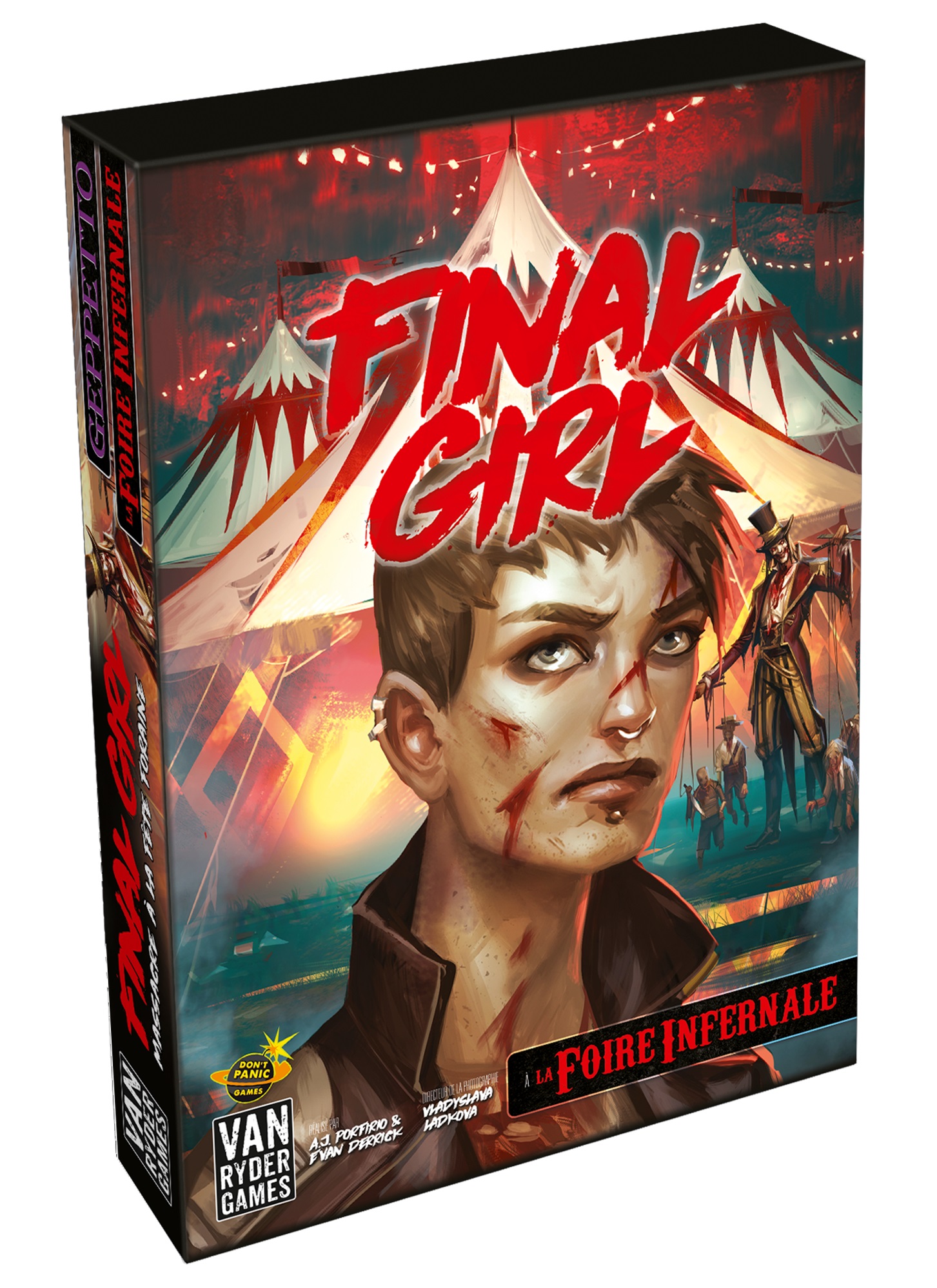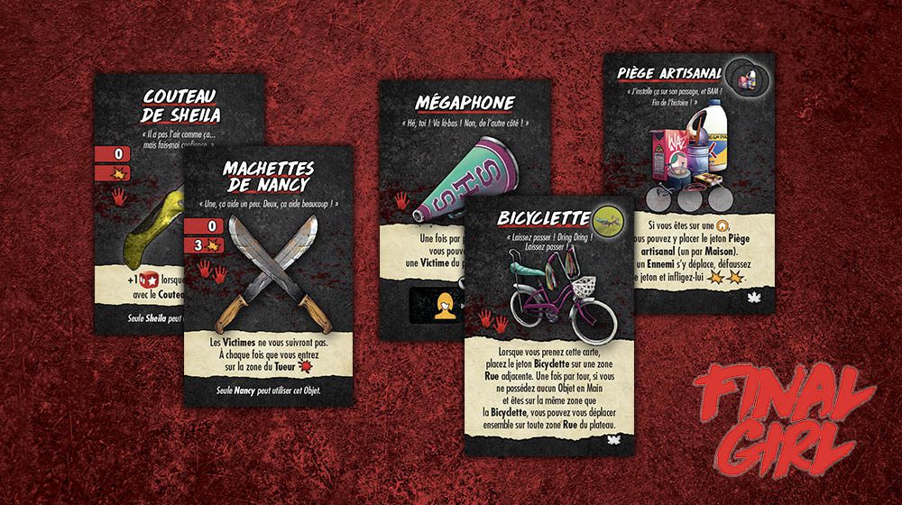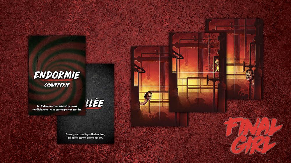Contenu: 1 plateau Tueur détachable, 1 plateau Lieu détachable, 2 cartes Survivante, 24 cartes Terreur, 3 cartes Pouvoir Maléfique, 1 carte Pouvoir Maléfique Légendaire, 3 cartes Finale, 19 cartes Objet, 10 cartes Événement, 5 cartes Disposition, 2 Livrets de règles, 21 jetons, 2 cartes Action, 4 cartes Chaufferie, 1 carte Éveillée/ Endormie.