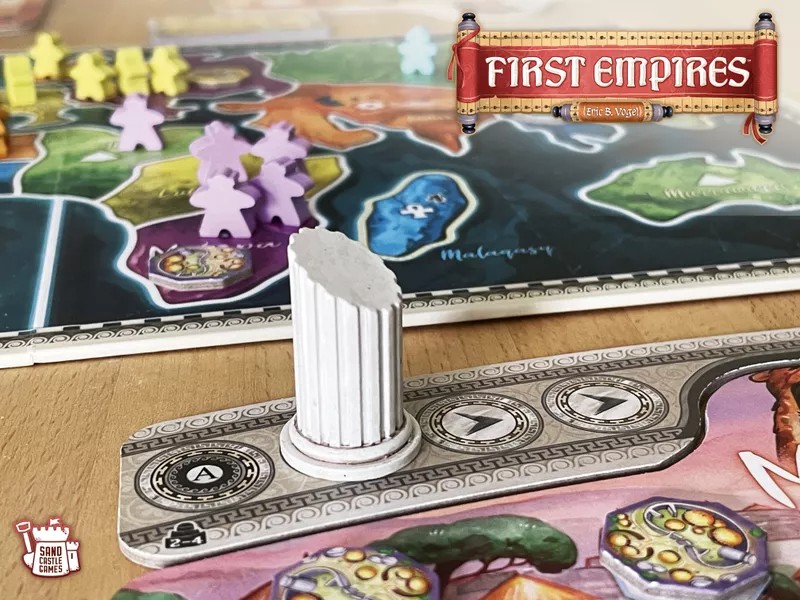 Dans First Empires , chaque joueur prend le contrôle du destin d’une ancienne nation à travers un plateau de jeu, des meeples et des cartes. Le jeu dure un certain nombre de tours en fonction du nombre de joueurs, et à chaque tour, vous lancez les dés en fonction de la façon dont vous avez développé votre plateau d’empire. Les six faces des dés correspondent aux cinq capacités de votre plateau. Pour vous étendre à de nouveaux territoires ou envahir des adversaires, vous devez débloquer la capacité de mouvement ; pour annexer un territoire, il faut être plus nombreux que l’occupant actuel ou avoir un résultat « épée » au dé, les habitants fuyant alors ailleurs. Les dés vous permettent également de développer votre plateau de joueur en utilisant la face de dé qui correspond à l’amélioration et au contrôle d’un territoire associé. Vous pouvez gagner plus de dés et de relances supplémentaires, tout en déverrouillant des cartes de réussite.
