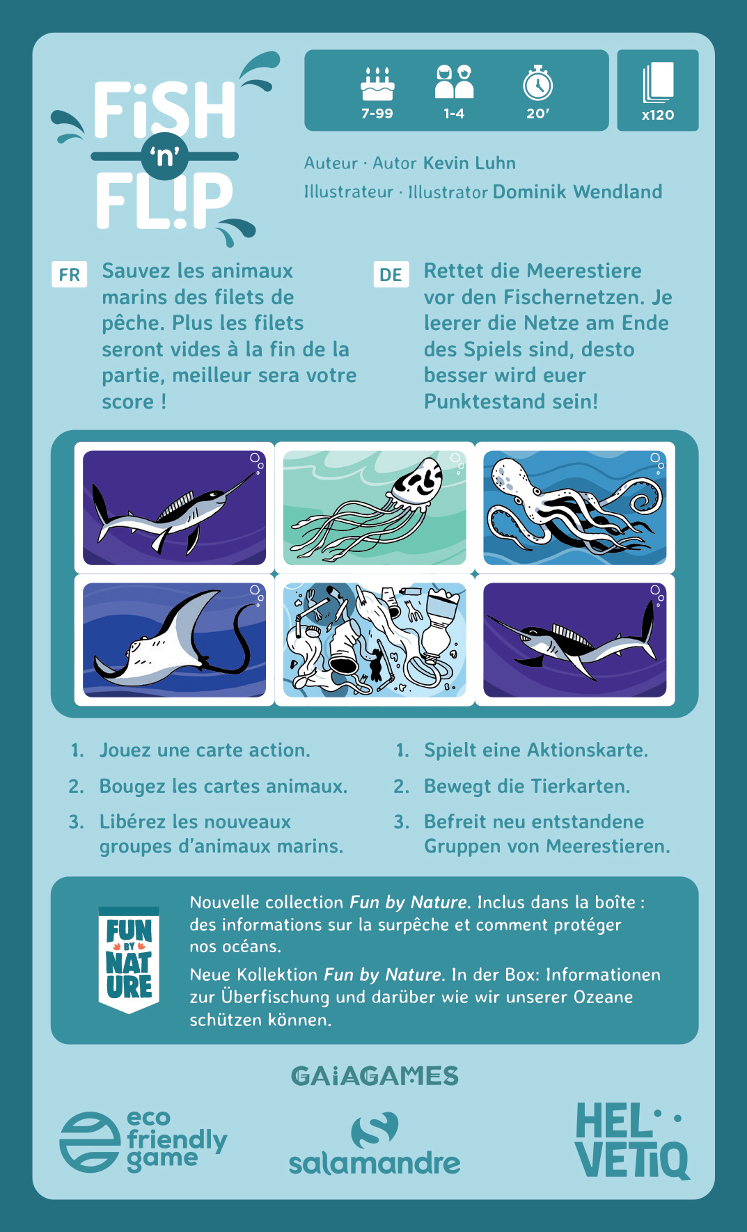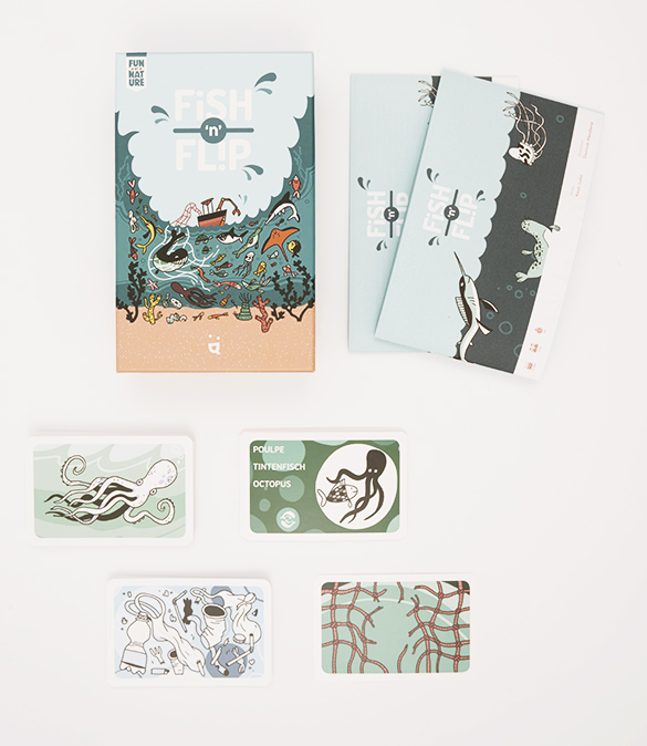 Inclus: 120 cartes dont 79 cartes animaux marins (10 cartes baleine, espadon, pieuvre, tortue, dauphin, méduse et raie, et 9 cartes requin), 1 carte bateau, 20 cartes action, 12 cartes déchets (6 plastique, 3 métal, 3 pétrole), 8 cartes de pouvoir (1 par animal).