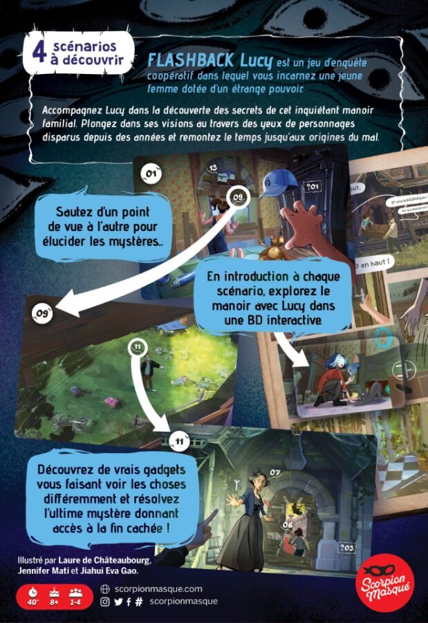 Mettez-vous à la place des personnages et découvrez leurs points de vue, accumulez les indices, élucidez les mystères, et répondez aux questions qui vous sont posées. À la différence de Flashback : Zombie Kidz, c’est d’époque en époque que vous allez voyager, en découvrant le manoir à différents moments dans le temps. Avant et après chacune des visions de Lucy, explorez le manoir avec son chat, Gredin, dans une bande dessinée interactive. Et bien sûr, découvrez des gadgets encore plus originaux et immersifs !