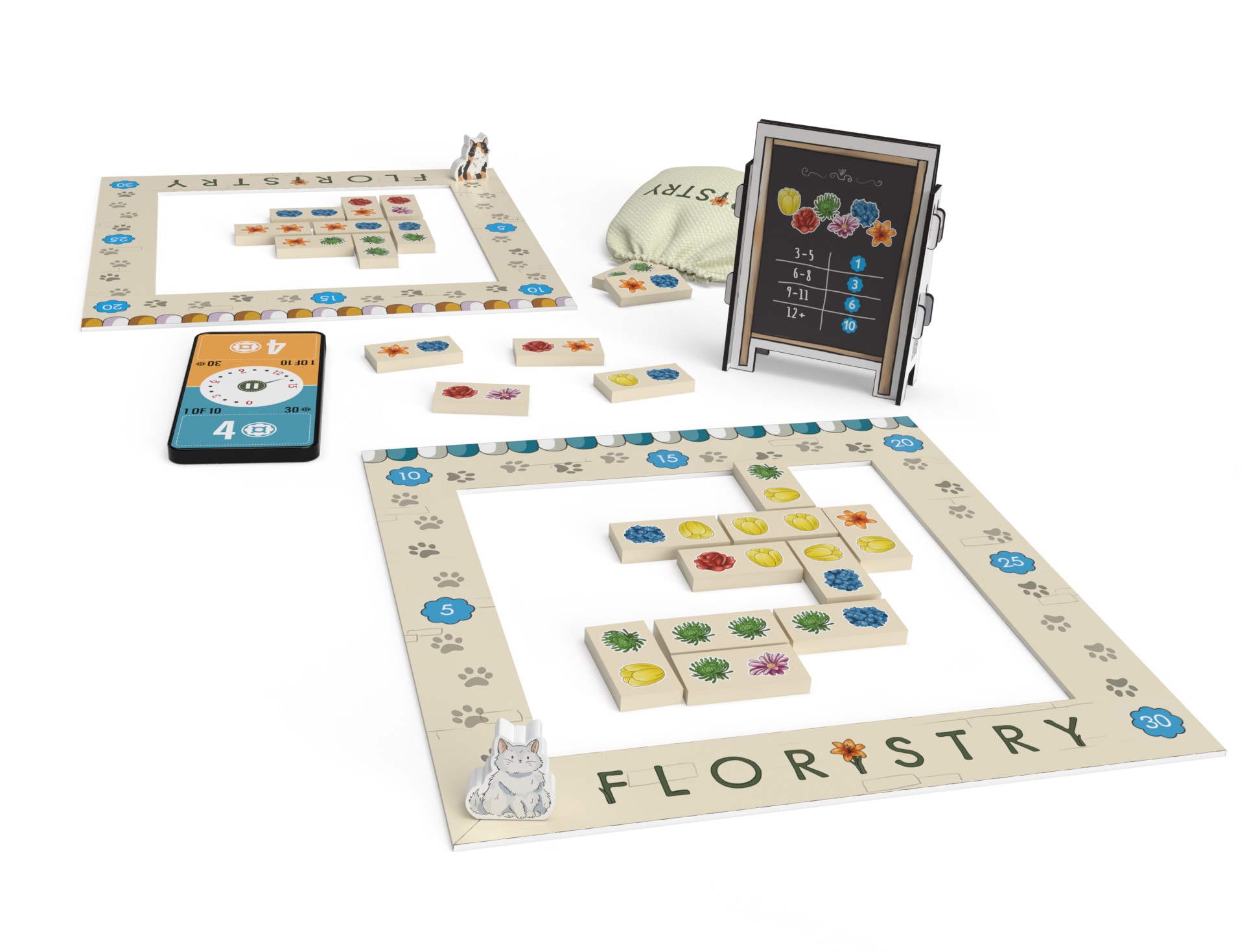 Floristry est un jeu de pose de tuiles pour 2 joueurs. Les joueurs s’affrontent lors de la vente aux enchères hollandaise historique d’Aalsmeer pour gagner les meilleures fleurs et les utiliser ensuite pour créer la plus charmante des vitrines. Chaque tour comprend une vente aux enchères hollandaise, où l’horloge compte à rebours à partir de 15 secondes tandis que le prix baisse toutes les 3 secondes.