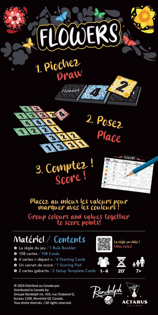 Flowers est un jeu de cartes pour 1 à 4 joueurs. Dans ce jeu de société magnifiquement illustré, vous créez votre zone de jeu en disposant au mieux les cartes devant vous afin de marquer un maximum de points.