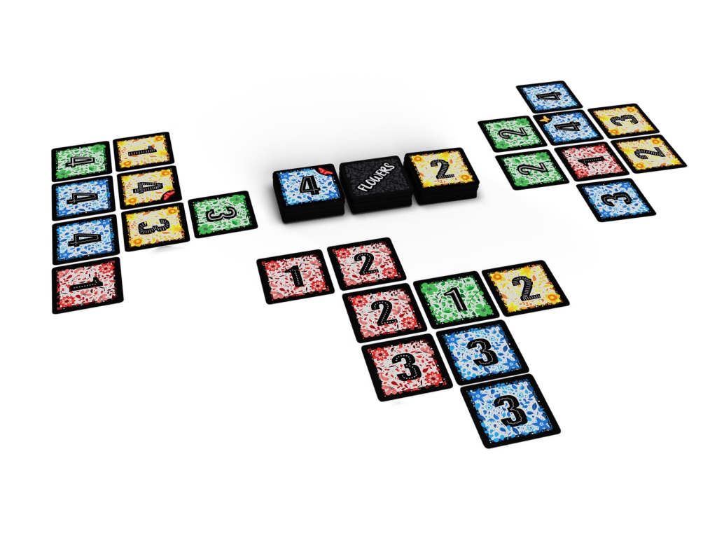 Dans le jeu Flowers, à tour de rôle, chaque joueur pioche une carte visible ou cachée et la place dans son espace de jeu. Lorsqu’une pile est vide, le jeu s’arrête et les points sont comptés.