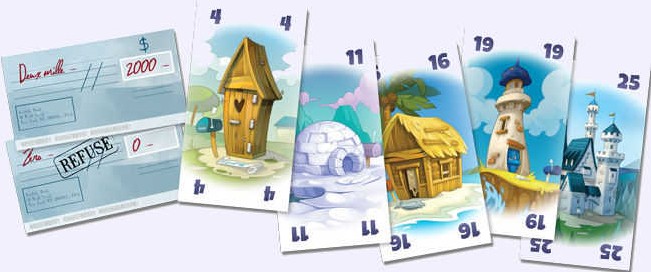Dans la phase d’achat, les joueurs enchérissent les uns après les autres. Lorsqu’un joueur passe, il récupère la carte Maison de plus petite Valeur encore disponible, et récupère la moitié de son enchère. Le dernier joueur, qui récupère donc la carte avec la plus grande valeur, dépense quant à lui la totalité de son enchère !