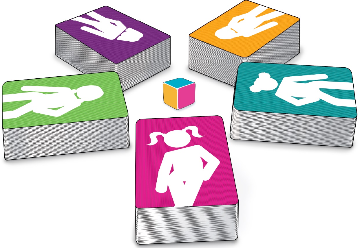 Contenu: 80 cartes rose, 80 cartes mauves, 80 cartes orange, 80 cartes vertes, 80 cartes bleue, 1 dé.
