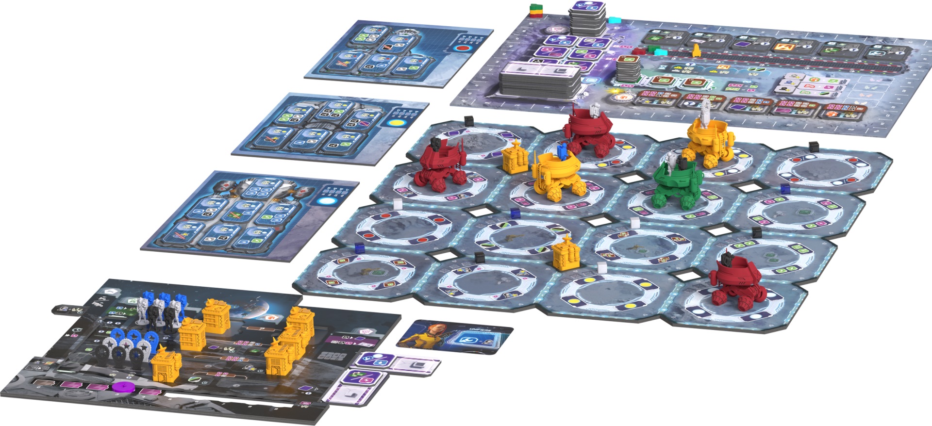 Contenu: Commun: 1 livret de Règles, 18 tuiles Mission, 3 plateaux Mission, 40 cubes Ressource Polymère (noir), 40 cubes Ressource Nourriture (vert), 40 cubes Ressource Acier (gris), 40 cubes Ressource Eau (bleu), 16 tuiles Terrain, 16 jetons Haut Fait, 16 jetons Haut Fait ×5, 10 tuiles Déroulement, 8 tuiles Grand Bâtiment, 24 tuiles Fondation, 54 tuiles Laboratoire, 1 jetons Premier Joueur, 3 jetons Pouvoir de Spécialiste, 3 tuiles Décollage, 1 plateau principal, 1 sac, 8 cartes Faction, 8 grandes tuiles Bâtiment de Faction, Pour chaque joueur: 1 plateau personnel, 9 jetons Batterie, 8 figurines Bâtiment, 1 pion Énergie, 3 figurines Rover, 4 figurines Astronaute Polymère (noir), 4 figurines Astronaute Acier (gris), 4 figurines Astronaute Eau (bleu), 9 marqueurs Spécialiste, 13 petites tuiles Bâtiment, 2 pions Joueur, 6 cubes Amélioration, 1 jeton +50 (recto)/ +100 (verso), 1 jeton +150 (recto) / +200 (verso), Mode Solo: 9 cartes Emplacement Rover, 16 cartes Zone de Bâtiment, 9 cartes Objectif.