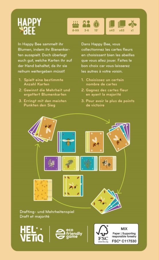 Dans Happy Bee, vous jouez des cartes abeilles et passez les autres à vos adversaires. Votre but : polliniser le plus grand nombre de fleurs. Choisissez bien les cartes abeilles que vous souhaitez jouer pour remporter la majorité et ainsi récupérer des fleurs. Mais prenez garde, vous n’êtes pas le ou la seul·e à vouloir récupérer les fleurs qui rapportent le plus de points de victoire.