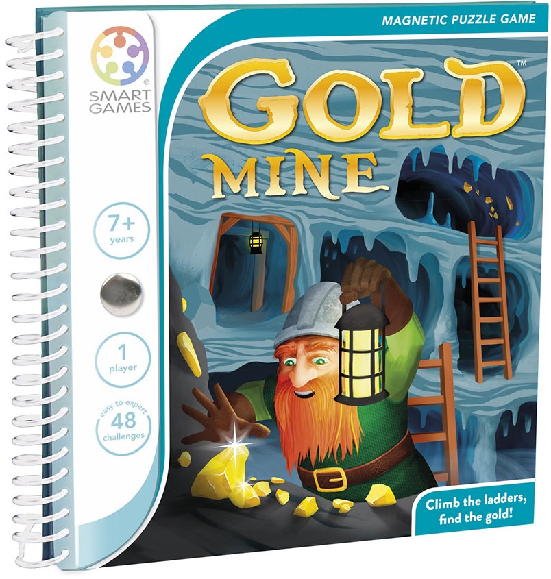 Pouvez-vous aider le nain à trouver l’or? Placez les 3 pièces de puzzle «échelle» sur le plateau de jeu pour que le nain puisse monter et descendre et atteindre le trésor. « Goldmine » est un jeu de voyage magnétique avec 48 défis, de facile à expert.