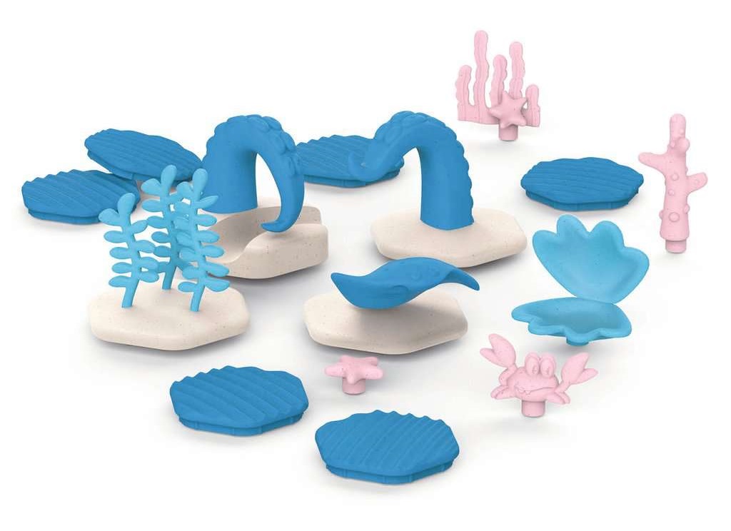 Les pièces sont pensées pour les tout-petits avec un contenu facile à prendre en main. Les matériaux sont principalement issus de ressources renouvelables, fabriqués en Europe et issus de matières biosourcées : fibres de bois et plastique bio.