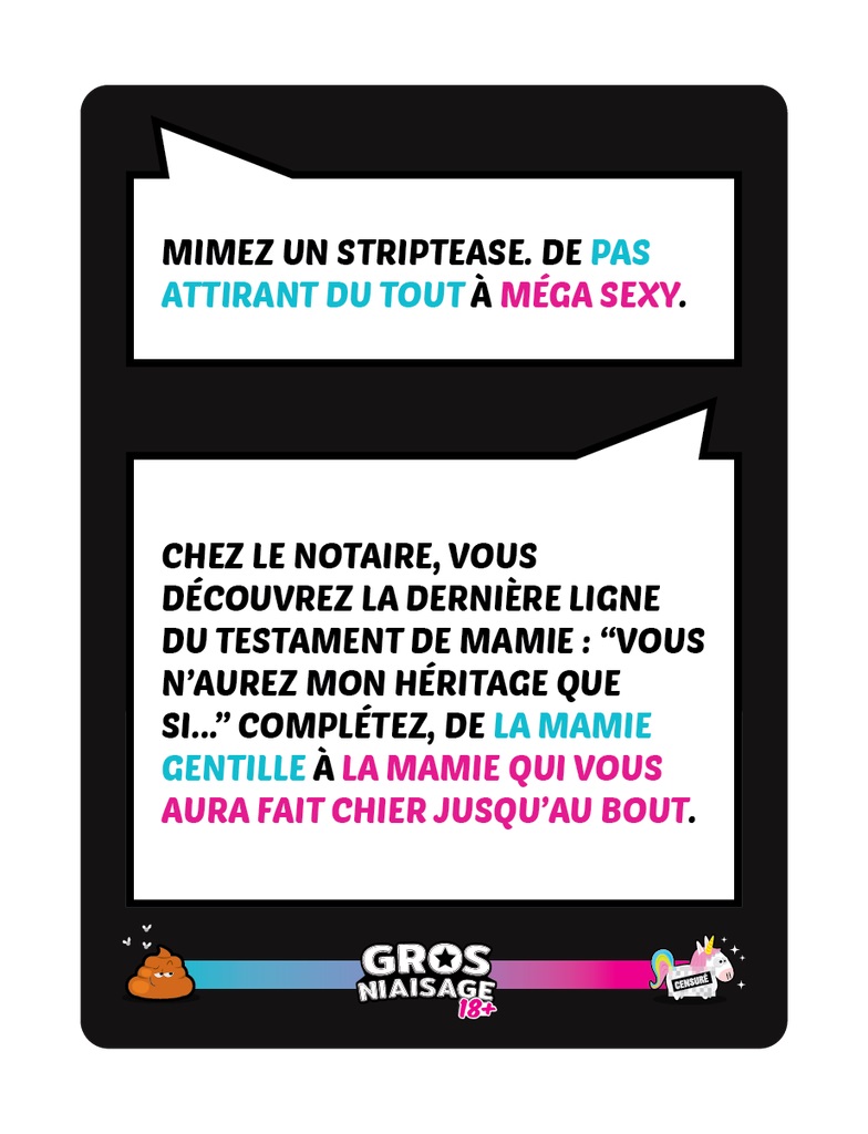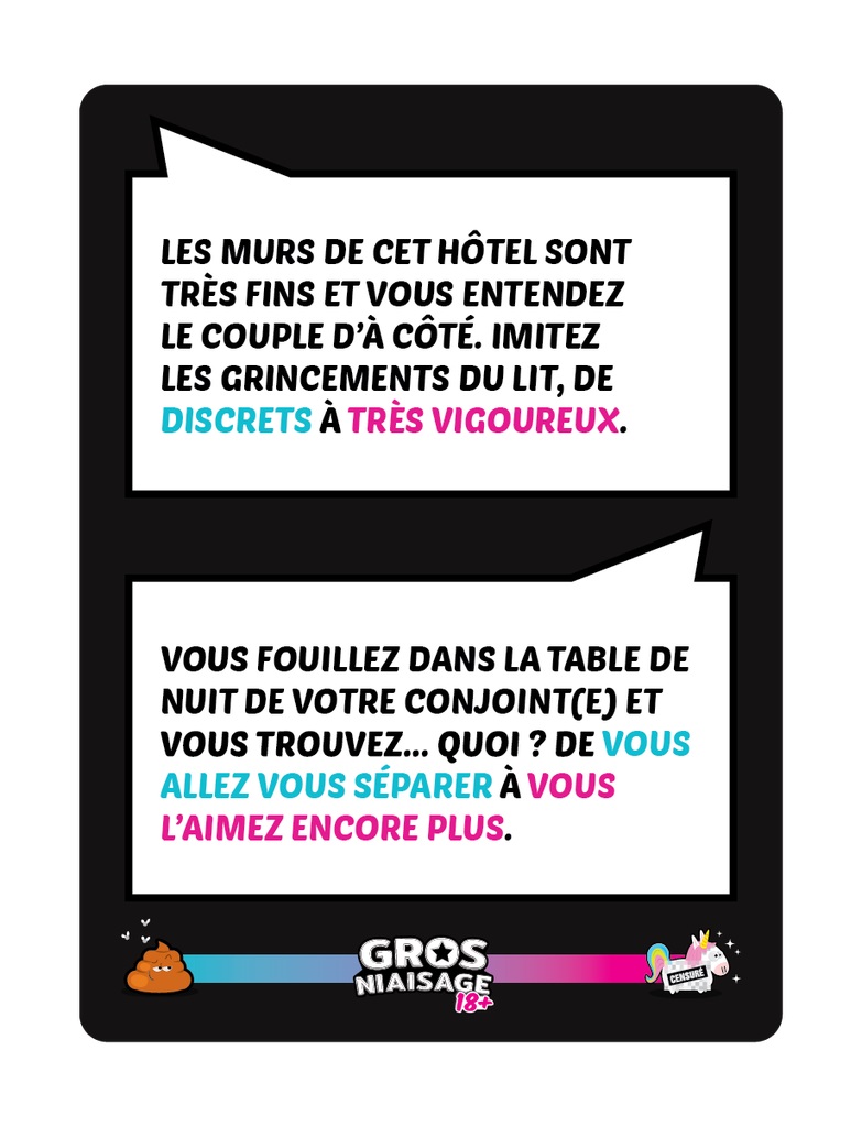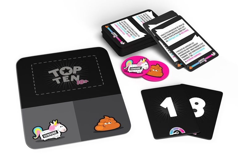 500 thèmes épicés et délirants qui vous feront inventer, raconter et mimer n’importe quoi ! Enfin un jeu où la surenchère de niaiserie est payante ! Ce jeu est la version pour adultes du célèbre jeu Top Ten ! Le principe est le même mais les thèmes sont plus pimentés !