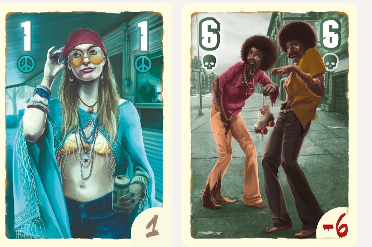 Jouez vos cartes d’un côté ou de l’autre du plateau. Côté «+», c’est la carte la plus haute qui remporte le pli, côté «-», c’est la carte la plus basse. Remportez les plis pour déclencher les pouvoirs des Faction, évitez les Zombies et renvoyez-les dans les autres Communautés pour limiter les pertes. Jouez les bonnes cartes au bon moment et bon endroit pour survivre à la Horde !