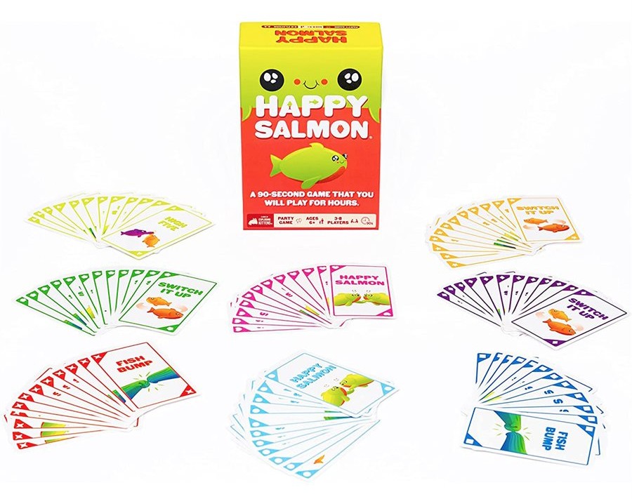 Happy Salmon est un jeu d’ambiance pour 3 à 8 personnes qui s’apprend en quelques secondes, mais qui vous procurera des heures de plaisir. C’est drôle, amusant et si irrésistible que vous attirerez l’attention de tous les passants quand vous allez y jouer.