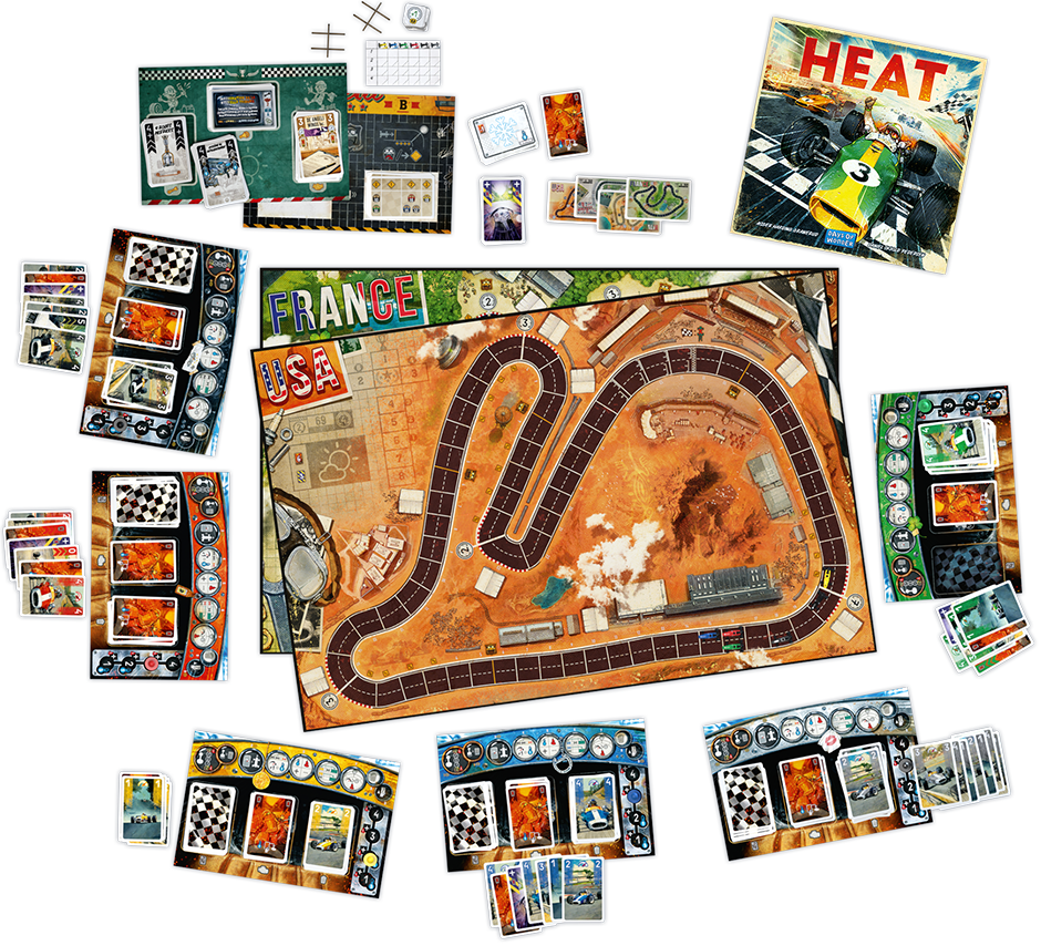 Inclus: 2 plateaux grand format recto/verso, (4 circuits), 4 cartes Circuit, 6 bolides et 6 leviers de vitesse, 6 tableaux de bord, 72 cartes vitesse, 48 cartes Heat & 37 cartes Stress, 114 cartes Amélioration, 35 carte Sponsor, 10 cartes Légendes, 10 cartes Évènement