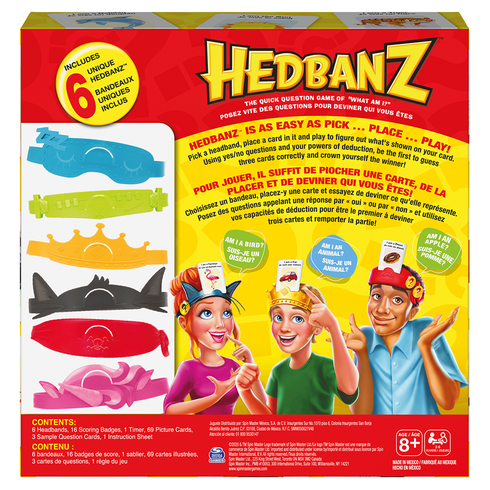 Dans Hedbanz, retrouvez le célèbre jeu de devinettes avec de nouvelles cartes, de nouveaux bandeaux et de nouvelles illustrations.
