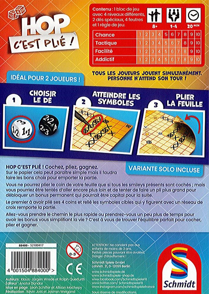 Dans Hop C’est Plié (« Peut plier »), tout le monde joue en même temps, marquant les espaces de son choix sur sa feuille de joueur individuelle en fonction du lancer de deux dés spéciaux à chaque tour.