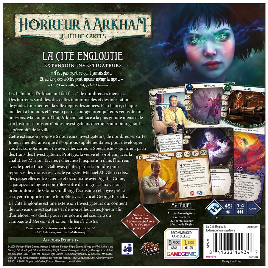 La Cité Engloutie – Extension Investigateurs propose six nouveaux enquêteurs pour Horreur à Arkham : Le Jeu de Cartes et ajoute une multitude de nouvelles cartes de joueur et d’options pour la construction de paquets, y compris de toutes nouvelles cartes « Spécialiste » qui jouent sur les traits des enquêteurs.
