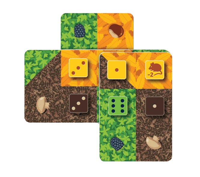 Parcourez la forêt à la recherche de nourriture sauvage. Ramassez autant de mûres, de châtaignes et de champignons que possible en superposant des zones boisées de même type. À chaque tour vous devrez jouer une carte, poser des dés, puis piocher une nouvelle carte. Agencez astucieusement vos 9 cartes pour optimiser votre récolte.