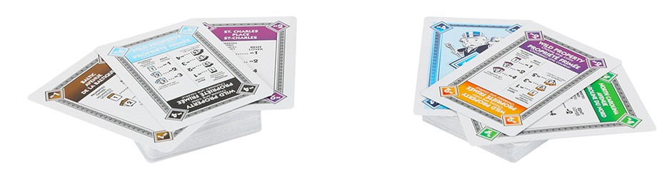 Le jeu comprend 110 cartes, dont des titres de propriété, des cartes Loyer, des cartes Maison et Hôtel, et des titres de propriété frimés. Les cartes Action permettent entre autres aux joueurs de réclamer un loyer et de conclure des marchés sournois. Les cartes Maison et Hôtel quant à elles font augmenter la valeur des loyers, tandis que les titres de propriété frimés aident les joueurs à compléter des groupes de propriétés. De plus, à ce jeu, on paie ses dettes avec des cartes Argent.