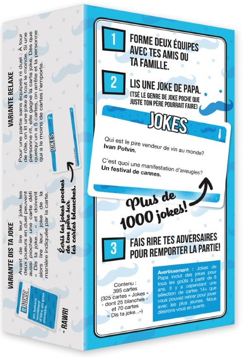 Contenu : 395 cartes (325 cartes « Jokes » – dont 25 blanches – et 70 cartes « Dis ta joke… »)