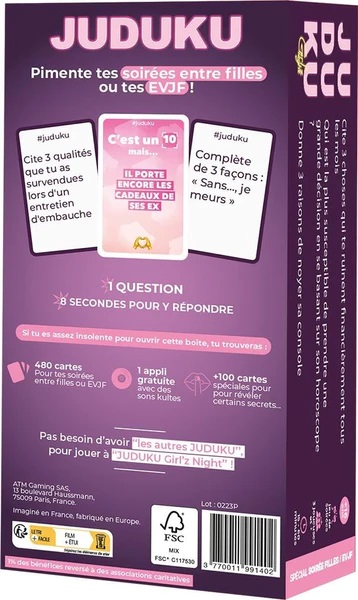 La gagnante devient à son tour la Queen du Juduku. C’est à elle de poser une question à la joueuse suivante. La première joueuse qui atteint le score de 7 points sera déclarée gagnante. Juduku « Girl’z Night » est la première édition de Juduku écrite par des filles pour les filles. Le jeu comporte 480 cartes délirantes dont 120 cartes spéciales réparties en 4 catégories.
