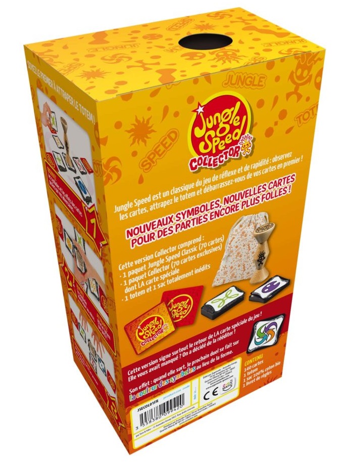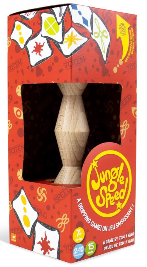 Bois certifié FSC et sac en coton bio. Un totem est placé au centre de la table et chacun a une pile de cartes dont il doit se débarrasser pour gagner.
